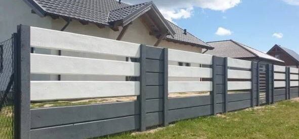 Секція складається з гладких горизонтальних панелей, які встановлюються у паз стовпа. Особливістю моделі є можливість комбінувати кольори: на фото представлено стильне поєднання графітової основи (стовпи та нижні секції) з контрастними білими панелями зверху. Такий підхід дозволяє створити «повітряний» вигляд паркану, який не захаращує простір, але чітко окреслює межі ділянки.